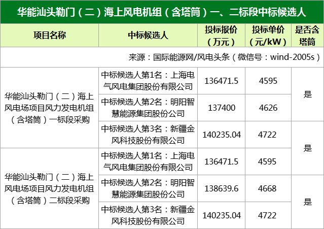 華能汕頭勒門(二)海上風(fēng)電場項(xiàng)目風(fēng)力發(fā)電機(jī)組(含塔筒)采購一、二標(biāo)段中標(biāo)候選人分別為上海電氣、明陽智能、金風(fēng)科技。