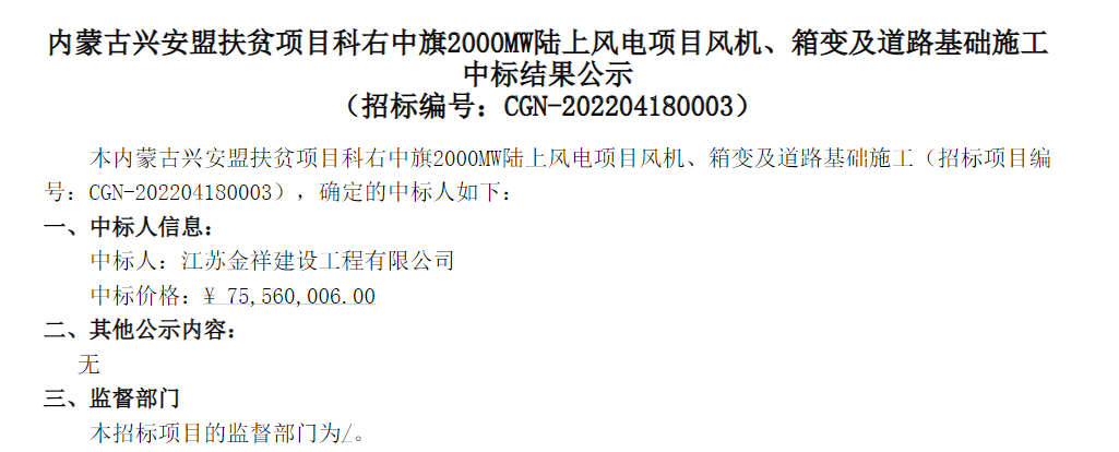 內(nèi)蒙古興安盟扶貧項目科右中旗2000MW陸上風(fēng)電項目風(fēng)機、箱變及道路基礎(chǔ)施工中標結(jié)果公示: