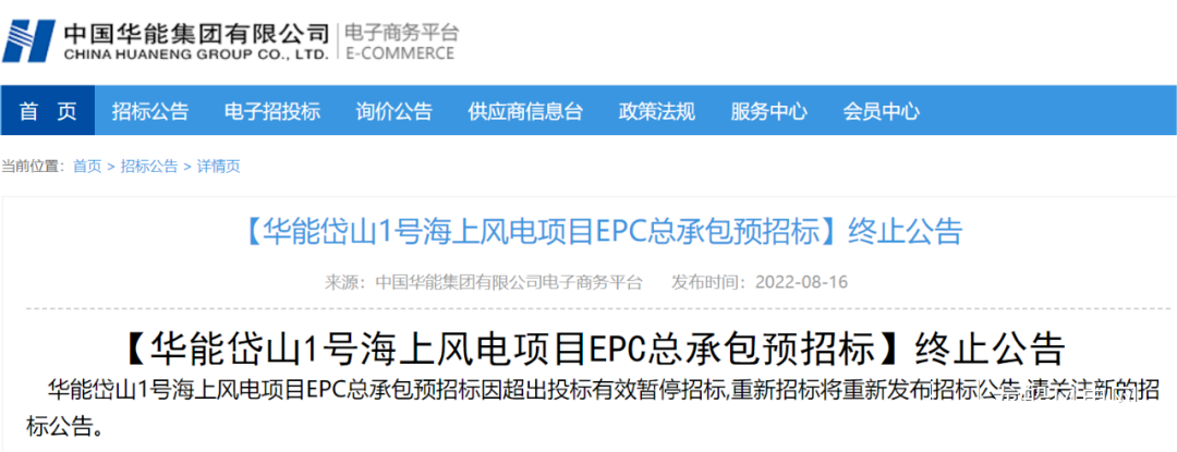 8月16日,華能集團發(fā)布公告稱,因超出投標有效期,決定終止華能岱山1號海上風電項目EPC總承包預招標項目。