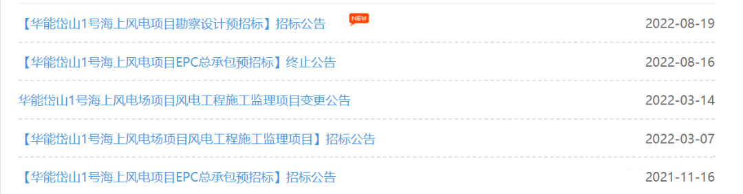 從華能電子商務平臺獲悉,《華能岱山1號海上風電項目EPC總承包預招標項目》于2021年11月16日發(fā)布招標公告。截止8月16日發(fā)布終止公告之日,已耗時近一年之久。