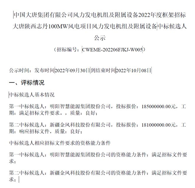 9月30日,中國大唐集團(tuán)有限公司風(fēng)力發(fā)電機(jī)組及附屬設(shè)備2022年度框架招標(biāo)大唐陜西志丹100MW風(fēng)電項目風(fēng)力發(fā)電機(jī)組及附屬設(shè)備中標(biāo)候選人公示,明陽智能預(yù)中標(biāo),投標(biāo)報價18500萬元。