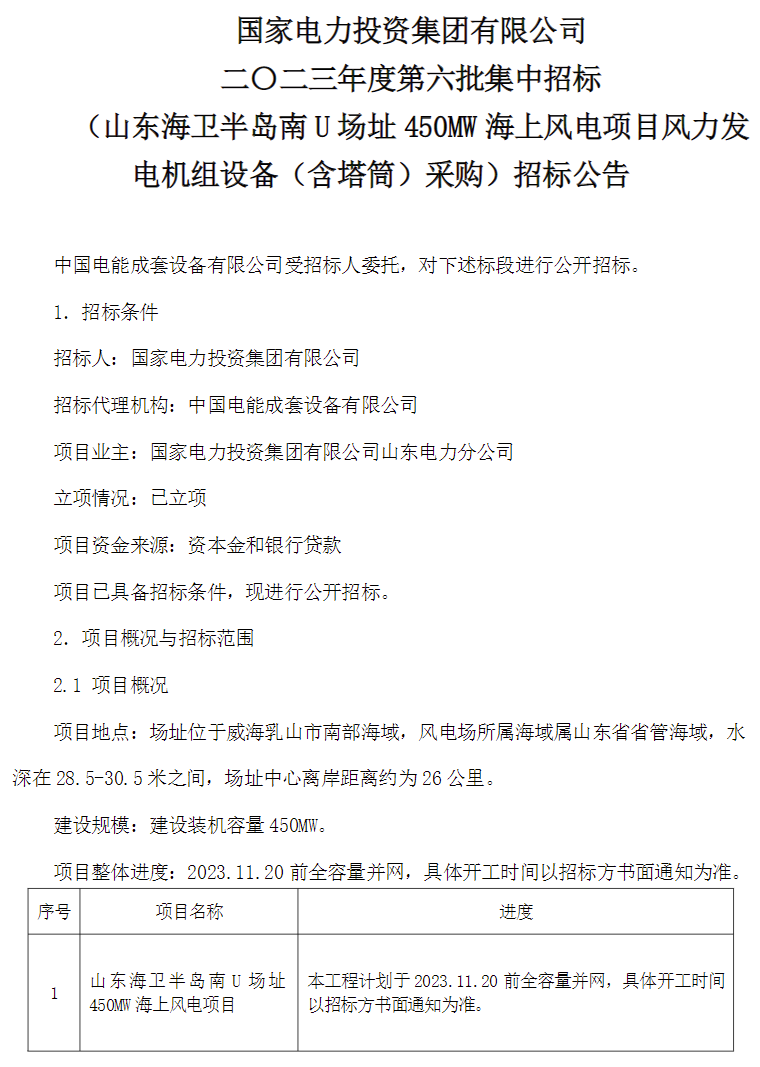 近日,國家電力投資集團有限公司發(fā)布二〇二三年度第六批集中招標(山東海衛(wèi)半島南 U場址 450MW海上風電項目風力發(fā)電機組設備(含塔筒)采購)招標公告,規(guī)模共計450MW,單臺機組容量要求 8.5MW及以上。
