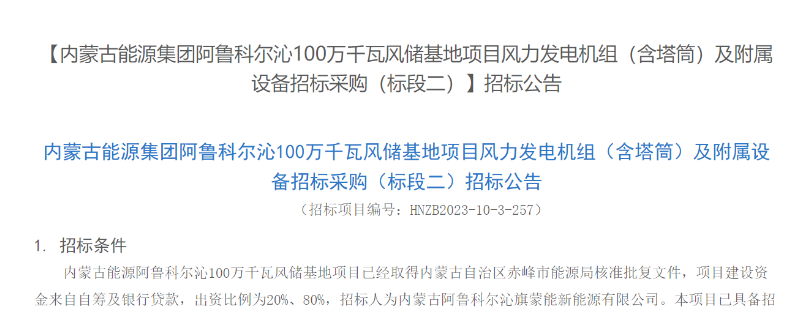 公告顯示,內(nèi)蒙古能源集團阿魯科爾沁100萬千瓦風(fēng)儲基地項目位于赤峰市阿魯科爾沁旗天山鎮(zhèn)、天山口鎮(zhèn)、巴拉奇如德蘇木,總裝機容量100萬千瓦,擬采用100臺單機容量10MW風(fēng)力發(fā)電機組。該項目計劃2023年12月05日開工建設(shè),2024年12月31日全容量并網(wǎng)。