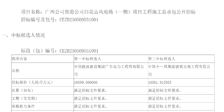 公告顯示,第一中標候選人:中國能源建設(shè)集團廣東電力工程局有限公司,投標報價:10399.000000萬元。第二中標候選人:鐵十一局集團建筑安裝工程有限公司,投標報價:10561.915935萬元。