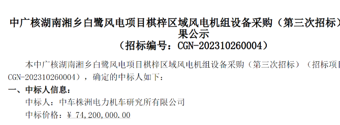1月2日,中廣核電子商務平臺發(fā)布《中廣核湖南湘鄉(xiāng)白鷺風電項目棋梓區(qū)域風電機組設備采購(第三次招標)中標結果公示》的公告。