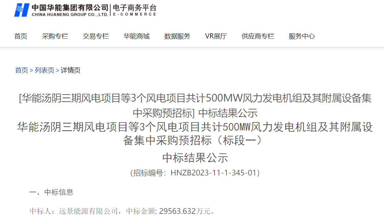 公告顯示,遠(yuǎn)景能源有限公司成功中標(biāo)該項(xiàng)目,中標(biāo)價(jià)格為29563.632萬(wàn)元。