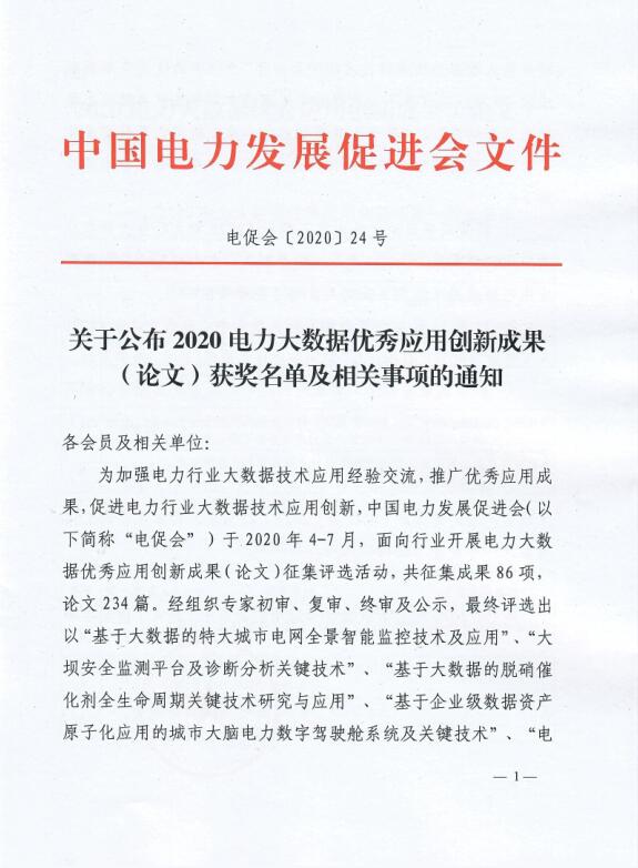 為加強電力行業(yè)大數(shù)據(jù)技術(shù)應(yīng)用經(jīng)驗交流,推廣優(yōu)秀應(yīng)用成果,促進電力行業(yè)大數(shù)據(jù)技術(shù)應(yīng)用創(chuàng)新,中國電力發(fā)展促進會(以下簡稱“電促會”)于2020年4-7月,面向行業(yè)開展電力大數(shù)據(jù)優(yōu)秀應(yīng)用創(chuàng)新成果(論文)征集評選活動,共征集成果86項,論文234篇。經(jīng)組織專家初審、復(fù)審及終審和公示,最終評選出以“基于大數(shù)據(jù)的特大城市電網(wǎng)全景智能監(jiān)控技術(shù)及應(yīng)用”、“大壩安全監(jiān)測平臺及診斷分析關(guān)鍵技術(shù)”、“基于大數(shù)據(jù)的脫硝催化劑全生命周期關(guān)鍵技術(shù)研究與應(yīng)用”、“基于企業(yè)級數(shù)據(jù)資產(chǎn)原子化應(yīng)用的城市大腦電力數(shù)字駕駛艙系統(tǒng)及關(guān)鍵技術(shù)”、“電能質(zhì)量大數(shù)據(jù)分析關(guān)鍵技術(shù)研究及應(yīng)用”為代表的優(yōu)秀應(yīng)用創(chuàng)新成果39項。以“基于大數(shù)據(jù)的變壓器油中溶解氣體關(guān)鍵狀態(tài)量動態(tài)預(yù)警研究”、“基于大數(shù)據(jù)技術(shù)的小水電機組負(fù)荷分配優(yōu)化平臺研究及應(yīng)用”為代表的優(yōu)秀論文74篇。現(xiàn)將有關(guān)事項通知如下: