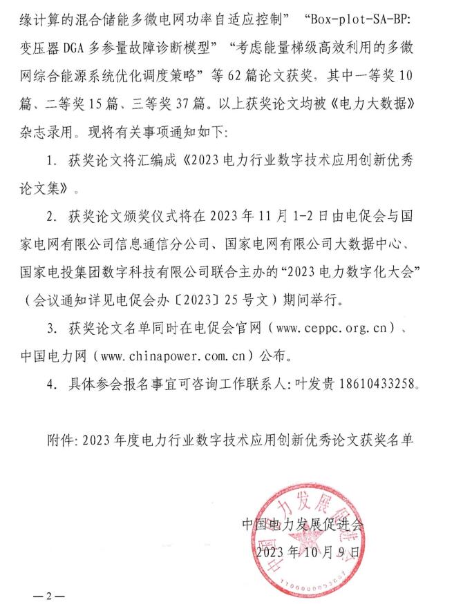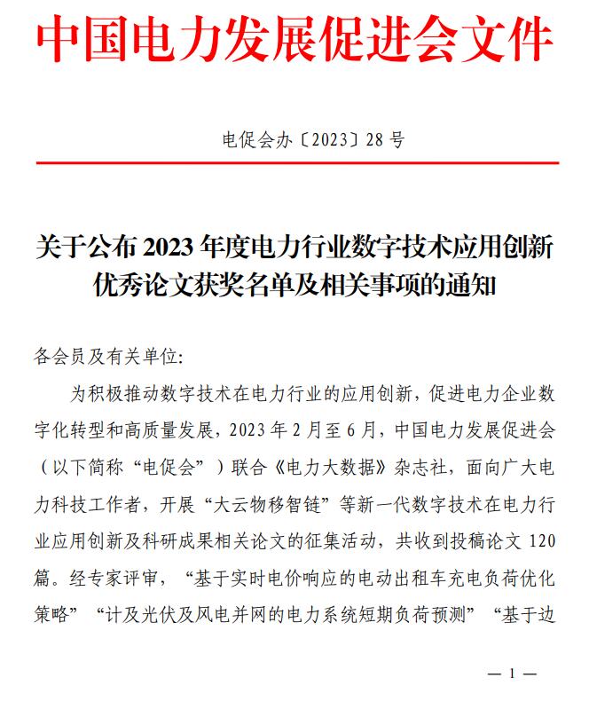 關(guān)于公布2023年度電力行業(yè)數(shù)字技術(shù)應(yīng)用創(chuàng)新優(yōu)秀論文獲獎名單及相關(guān)事項(xiàng)的通知