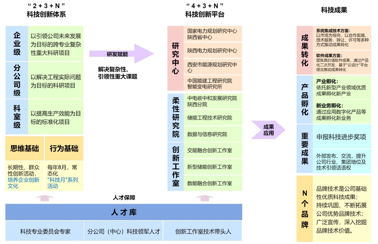 系統(tǒng)重構(gòu)科技研發(fā)體系。建立“2+3+N”差異化科技創(chuàng)新研發(fā)體系(2個(gè)基礎(chǔ),3層級(jí)研發(fā)項(xiàng)目,N項(xiàng)品牌技術(shù)):2個(gè)基礎(chǔ),即思維基礎(chǔ):開展長(zhǎng)期性、群眾性的“員工創(chuàng)新創(chuàng)效大賽”;行為基礎(chǔ):每年常態(tài)化開展“科技月”系列活動(dòng)。3個(gè)層級(jí),即科室級(jí)以提高生產(chǎn)效能為目標(biāo)的標(biāo)準(zhǔn)化項(xiàng)目,分公司級(jí)以解決工程實(shí)際問(wèn)題為目標(biāo)的科研項(xiàng)目,企業(yè)級(jí)以引領(lǐng)公司未來(lái)發(fā)展為目標(biāo)的跨專業(yè)復(fù)雜性科研項(xiàng)目。此外,通過(guò)“員工創(chuàng)新創(chuàng)效競(jìng)賽”,補(bǔ)齊陜西院研發(fā)體系中面向員工層面的科技創(chuàng)新機(jī)制拼圖。N項(xiàng)品牌,即鞏固“特高壓輸電線路”“超高壓電纜”“地下變電站”“蘭炭尾氣發(fā)電”“背壓機(jī)組”等傳統(tǒng)品牌優(yōu)勢(shì),拓展“源網(wǎng)荷儲(chǔ)一體化”“風(fēng)光水火儲(chǔ)一體化”“生物質(zhì)及固廢綜合利用”等創(chuàng)新品牌技術(shù)。差異化科技創(chuàng)新體系的建成,讓技術(shù)優(yōu)勢(shì)轉(zhuǎn)化成市場(chǎng)競(jìng)爭(zhēng)優(yōu)勢(shì),充分發(fā)揮科技創(chuàng)新對(duì)業(yè)務(wù)發(fā)展的支撐和驅(qū)動(dòng)作用。