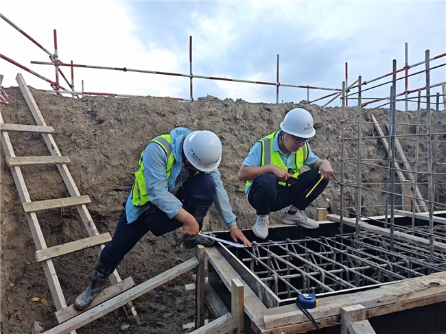 在 3#廠房承臺(tái)鋼筋安裝、連接的驗(yàn)收環(huán)節(jié),黨員們展現(xiàn)出了扎實(shí)的專業(yè)知識(shí)和豐富的實(shí)踐經(jīng)驗(yàn)。他們認(rèn)真核對(duì)鋼筋的品種、規(guī)格、數(shù)量和位置,確保與設(shè)計(jì)圖紙毫無偏差。對(duì)于鋼筋的連接方式,無論是焊接還是機(jī)械連接,他們都嚴(yán)格按照規(guī)范進(jìn)行檢驗(yàn),檢查接頭的外觀質(zhì)量、焊縫的飽滿度、機(jī)械連接的擰緊力矩等,確保連接牢固可靠。同時(shí),他們還高度關(guān)注鋼筋的錨固長(zhǎng)度、間距以及保護(hù)層厚度等關(guān)鍵指標(biāo),以保障結(jié)構(gòu)的安全性和耐久性。
