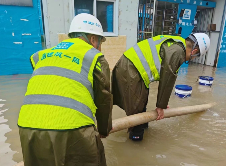 中建一局所屬在京項目通過壘筑防洪沙袋、運轉(zhuǎn)大功率抽水機(jī)緊急排水、夜間組織人員通宵值班巡查等舉措,全力搶救物資,把損失降到最低,并配備防汛沙袋、塑料布以及水泵、挖機(jī)等進(jìn)行排水防汛,確保安全度過汛期。