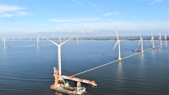 風(fēng)從海上來,吹來源源不斷的綠色能源。由中國(guó)電建承建的中企境外首個(gè)海上風(fēng)電EPC工程——薄寮三期、朔莊一期海上風(fēng)電項(xiàng)目,57臺(tái)國(guó)產(chǎn)“大風(fēng)車”,在92平方公里的海域內(nèi)勻速旋轉(zhuǎn),年上網(wǎng)電量約4.9億千瓦時(shí),可滿足當(dāng)?shù)?5萬居民的平均年用電需求。