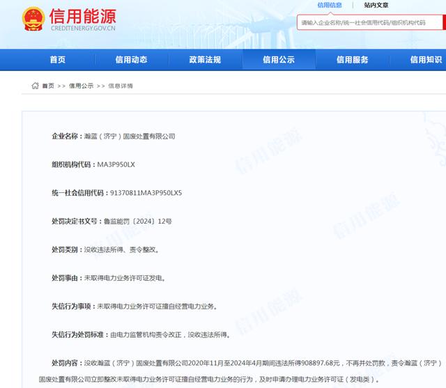 日前,信用能源公布了對瀚藍(濟寧)固廢處置有限公司的行政處罰決定,魯監(jiān)能罰〔2024〕12號處罰決定書文號顯示,瀚藍(濟寧)固廢處置有限公司未取得電力業(yè)務許可證發(fā)電。山東能源監(jiān)管辦沒收瀚藍(濟寧)固廢處置有限公司2020年11月至2024年4月期間違法所得908897.68元,不再并處罰款,責令瀚藍(濟寧)固廢處置有限公司立即整改未取得電力業(yè)務許可證擅自經(jīng)營電力業(yè)務的行為,及時申請辦理電力業(yè)務許可證(發(fā)電類)。