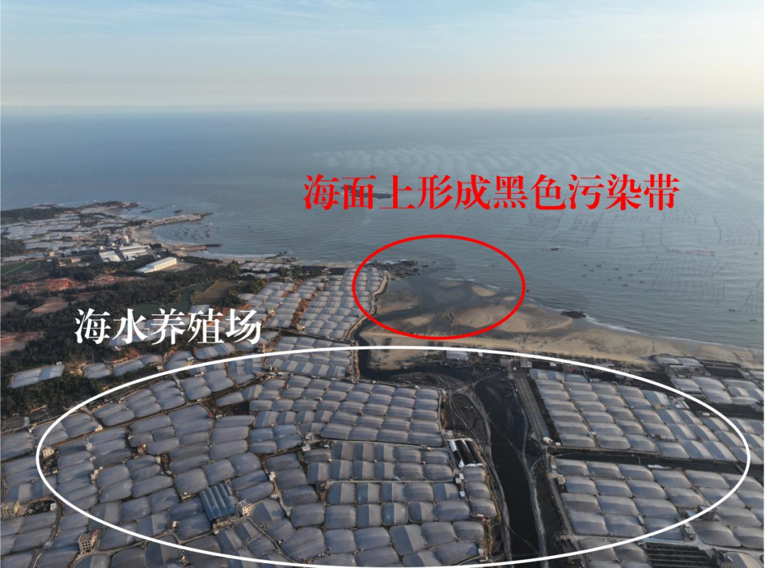 ▲圖4 2023年11月26日,督察組現(xiàn)場(chǎng)督察使用無(wú)人機(jī)拍攝,漳浦縣將軍灣沿岸密集分布提水式海水養(yǎng)殖場(chǎng),大量養(yǎng)殖尾水通過(guò)溪流直排入海,在海面上形成黑色污染帶