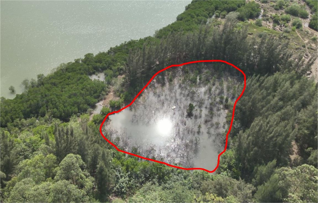 ▲圖2 2023年11月23日,督察組現(xiàn)場(chǎng)督察使用無(wú)人機(jī)拍攝,臨高縣彩橋紅樹(shù)林自然保護(hù)區(qū)內(nèi)900余株紅樹(shù)林枯死