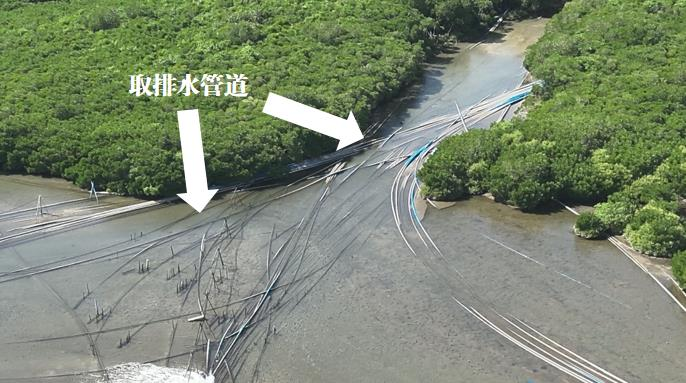 ▲圖5 2023年11月22日,督察組現(xiàn)場(chǎng)督察使用無(wú)人機(jī)拍攝,養(yǎng)殖塘取排水設(shè)施穿越清瀾紅樹(shù)林省級(jí)自然保護(hù)區(qū)核心區(qū)