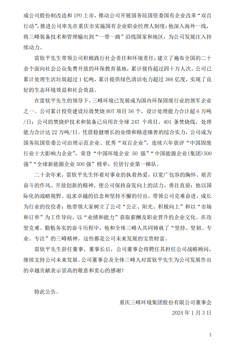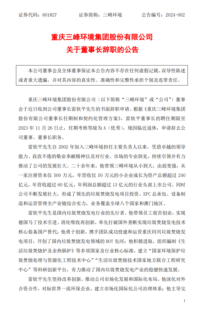1月3日,三峰環(huán)境發(fā)布公告稱,公司董事會于近日收到董事長雷欽平先生的書面辭職申請。根據(jù)《重慶三峰環(huán)境集團(tuán)股份有限公司董事長任期制和契約化管理方案》,雷欽平董事長的聘任期限至2023年11月26日止,任期考核等級為A(優(yōu)秀),現(xiàn)因臨近退休,申請辭去公司董事、董事長職務(wù)。