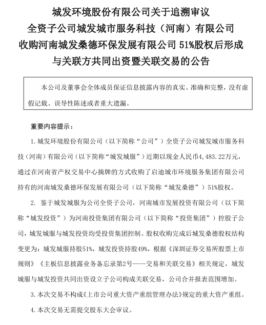 城發(fā)環(huán)境全資子公司收購河南城發(fā)桑德環(huán)保發(fā)展51%股權(quán)!