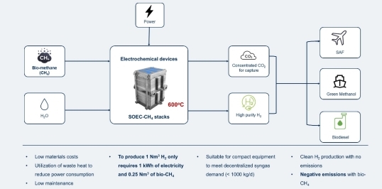 采用更先進(jìn)的電化學(xué)路線,將生物天然氣、綠電、水輸入電堆,在600℃運(yùn)行溫度下,同時產(chǎn)出高純度綠氫和自富集的CO2,一次性解決綠色燃料合成時的兩大重點(diǎn)原料的來源問題。不僅簡化了流程,更縮減了成本。在其他項目仍在使用其他電解水制氫裝備,以3-5度/標(biāo)方的電耗制取綠氫,同時增設(shè)空氣捕集裝置來捕集CO2時。電堆科技已經(jīng)做到,制取1標(biāo)方氫氣,僅需1度電及0.25標(biāo)方生物天然氣,且無需增設(shè)空氣捕集裝置。
