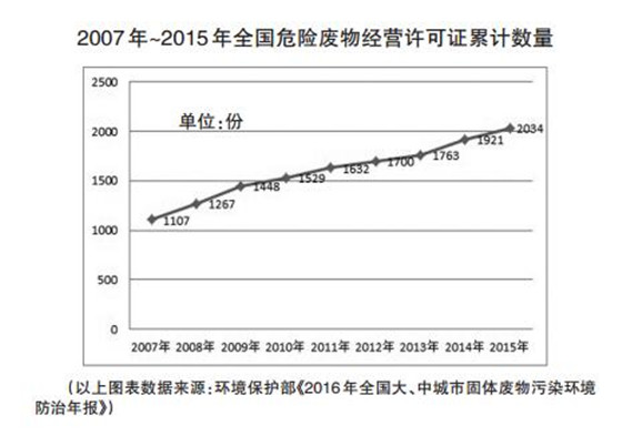 環(huán)境保護(hù)部近日公布的《2016年全國(guó)大、中城市固體廢物污染環(huán)境防治年報(bào)》(以下簡(jiǎn)稱《2016年報(bào)》)顯示,全國(guó)危險(xiǎn)廢物處理能力明顯提高,截至2015年底,各省(區(qū)、市)累計(jì)頒發(fā)的危險(xiǎn)廢物(含醫(yī)療廢物)經(jīng)營(yíng)許可證共2034份,比2014年增加113份,全國(guó)危險(xiǎn)廢物經(jīng)營(yíng)單位核準(zhǔn)危廢處理能力達(dá)5263萬(wàn)噸/年,較同期提高959萬(wàn)噸/年。