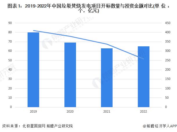 垃圾焚燒發(fā)電行業(yè)在歷經(jīng)“跑馬圈地”、“搶裝潮”等時期后,進入冷靜發(fā)展期。北極星固廢網(wǎng)統(tǒng)計了2019年-2022年的垃圾焚燒發(fā)電項目開標數(shù)量以及投資總額,整體呈逐年下滑趨勢。2022年中國垃圾焚燒發(fā)電項目開標數(shù)量下降為65項,總投資金額為258億元。