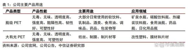 國(guó)內(nèi)瓶級(jí)PET龍頭,成立于2008年,主營(yíng)聚酯材料的研發(fā)、生產(chǎn)和銷(xiāo)售等業(yè)務(wù),主要產(chǎn)品有瓶級(jí)PET、大有光PET、光伏背板基材PET和其他PET等,可廣泛應(yīng)用于礦泉水瓶、碳酸飲料瓶、熱罐裝飲料瓶、藥品瓶、日化用品瓶、食用油瓶、改性塑料、膜材和片材等眾多領(lǐng)域。