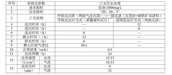 三采污水站分為普通聚驅(qū)污水站、高濃度聚驅(qū)污水站、三元污水站等,普通聚驅(qū)污水處理工藝流程與普通污水處理工藝流程相同,只是在過濾介質(zhì)、技術(shù)界限及工藝參數(shù)上做出調(diào)整。過濾介質(zhì)選擇適合含聚污水處理使用的石英砂、磁鐵礦等。當(dāng)含聚污水中聚合物濃度高于450mg/L時,采用高濃度聚驅(qū)污水處理工藝,主要區(qū)別在于增加了沉降時間,過濾罐由石英砂改為石英砂磁鐵礦雙濾料過濾工藝。當(dāng)處理含表活劑、聚合物、堿的三元污水時采用“連續(xù)流氣浮、序批曝氣沉降、石英砂磁鐵礦、海綠石磁鐵礦過濾”處理工藝三元污水處理工藝。
