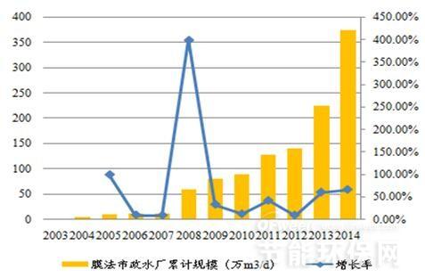 市政大規(guī)模MBR應(yīng)用和膜法市政水廠規(guī)模變化與膜法水處理行業(yè)產(chǎn)值變化趨勢(shì)高度一致