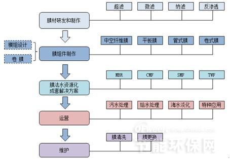 膜法水處理產(chǎn)業(yè)鏈由膜材料研發(fā)和制作、膜組件制作、膜法水資源化成套解決方案、運(yùn)營(yíng)和維護(hù)組成。其中膜法水資源化整體解決方案又涵蓋了工藝方案、投標(biāo)、詳細(xì)設(shè)計(jì)、系統(tǒng)集成、施工安裝、系統(tǒng)試車、技術(shù)支持和售后服務(wù)等流程。其中,膜材料/膜元件制作和研發(fā)在整條產(chǎn)業(yè)鏈中擁有更高的技術(shù)先進(jìn)性和盈利性。