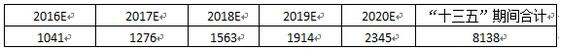 在2006至2011年的規(guī)模化工程應(yīng)用階段,行業(yè)產(chǎn)值復(fù)合年均增速為21%,在2011年至2015年的全面推廣階段這一數(shù)值達(dá)到30%。目前雖然我國(guó)城鎮(zhèn)污水處理率已達(dá)90%,污水處理產(chǎn)能增長(zhǎng)空間有限,但考慮到存量處理能力改造,再生水回用和工業(yè)廢水處理的潛在市場(chǎng)空間,以及排放指標(biāo)進(jìn)一步收嚴(yán),民眾對(duì)于選擇先進(jìn)環(huán)保技術(shù)的心理傾向等因素,“十三五”期間膜法水處理行業(yè)產(chǎn)值年均增速大概率落在20%-25%。取中位數(shù)22.5%進(jìn)行計(jì)算,到2020年行業(yè)產(chǎn)值達(dá)到約2345億,整個(gè)“十三五”膜法水處理產(chǎn)值可達(dá)8138億元。