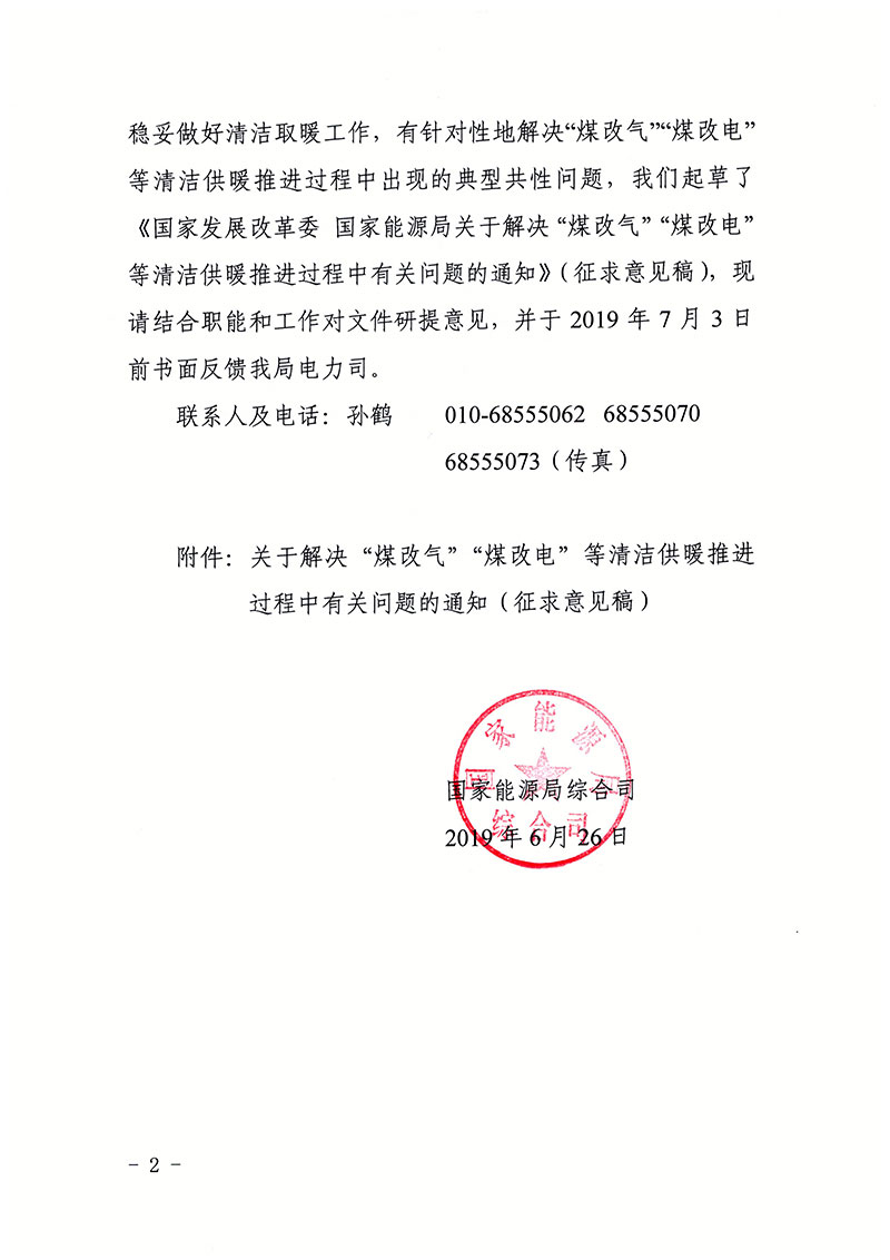 國(guó)家能源局綜合司征求《關(guān)于解決“煤改氣”“煤改電”等清潔供暖推進(jìn)過程中有關(guān)問題的通知》意見的函