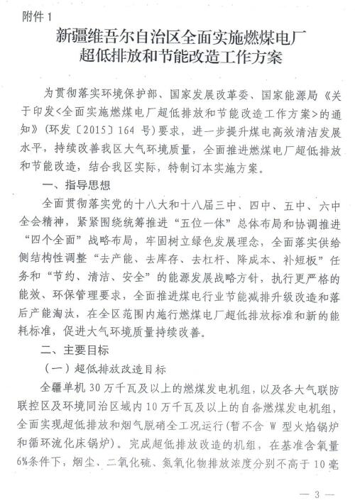 新疆自治區(qū)環(huán)保廳、發(fā)改委、經(jīng)信委、國(guó)家能源局新疆監(jiān)管辦、能源局關(guān)于印發(fā)《新疆維吾爾自治區(qū)全面實(shí)施燃煤電廠超低排放和節(jié)能改造工作方案》的通知(新環(huán)發(fā)[2016]379號(hào))已經(jīng)印發(fā)。方案提出,全面推進(jìn)煤電行業(yè)節(jié)能減排升級(jí)改造和落后產(chǎn)能淘汰,在全區(qū)范圍內(nèi)實(shí)施燃煤電廠超低排放標(biāo)準(zhǔn)和新的能耗標(biāo)準(zhǔn)。方案要求,全疆30萬(wàn)千瓦及以上燃煤發(fā)電機(jī)組,以及各大氣聯(lián)防聯(lián)控區(qū)及環(huán)境同治區(qū)域內(nèi)10萬(wàn)千瓦及以上自備燃煤發(fā)電機(jī)組,全面實(shí)行超低排放和煙氣脫硝全工況運(yùn)行(咱不含W型火焰鍋爐和循環(huán)流化床鍋爐)。全文如下: