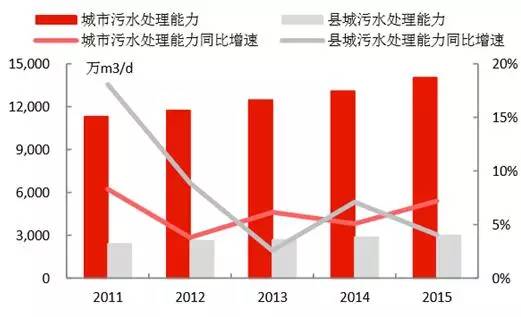 4)城市污水處理能力在2015年達(dá)到1.40億立方米/日,同比增長7.19%;縣城達(dá)到2999萬立方米/日,同比增長了4.06%,城市和縣城的污水處理率分別達(dá)到91.9%和85.2%,較2010年分別提升了9.6和25.1個百分點。