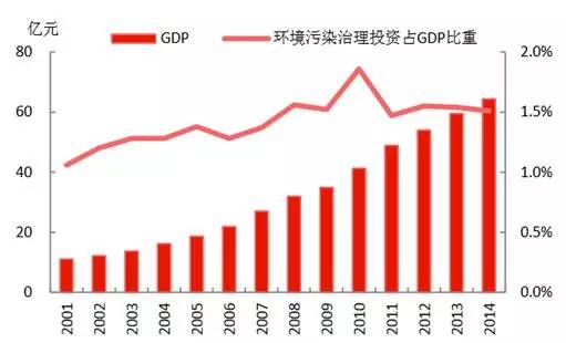從國家統(tǒng)計局的數(shù)據(jù)可以看到,我國在環(huán)境污染治理方面的投資量,呈現(xiàn)上升趨勢,2014年達(dá)到9576億元;近年占GPD的比重維持在1.5%左右,較2001年提升約0.5個百分點。發(fā)改委、環(huán)保部印發(fā)《關(guān)于培育環(huán)境治理和生態(tài)保護(hù)市場主體的意見》,提出目標(biāo),“十三五”綠色環(huán)保產(chǎn)業(yè)產(chǎn)值年均增長15%以上,遠(yuǎn)高于CDP的增長目標(biāo),為經(jīng)濟(jì)增長注入動力。