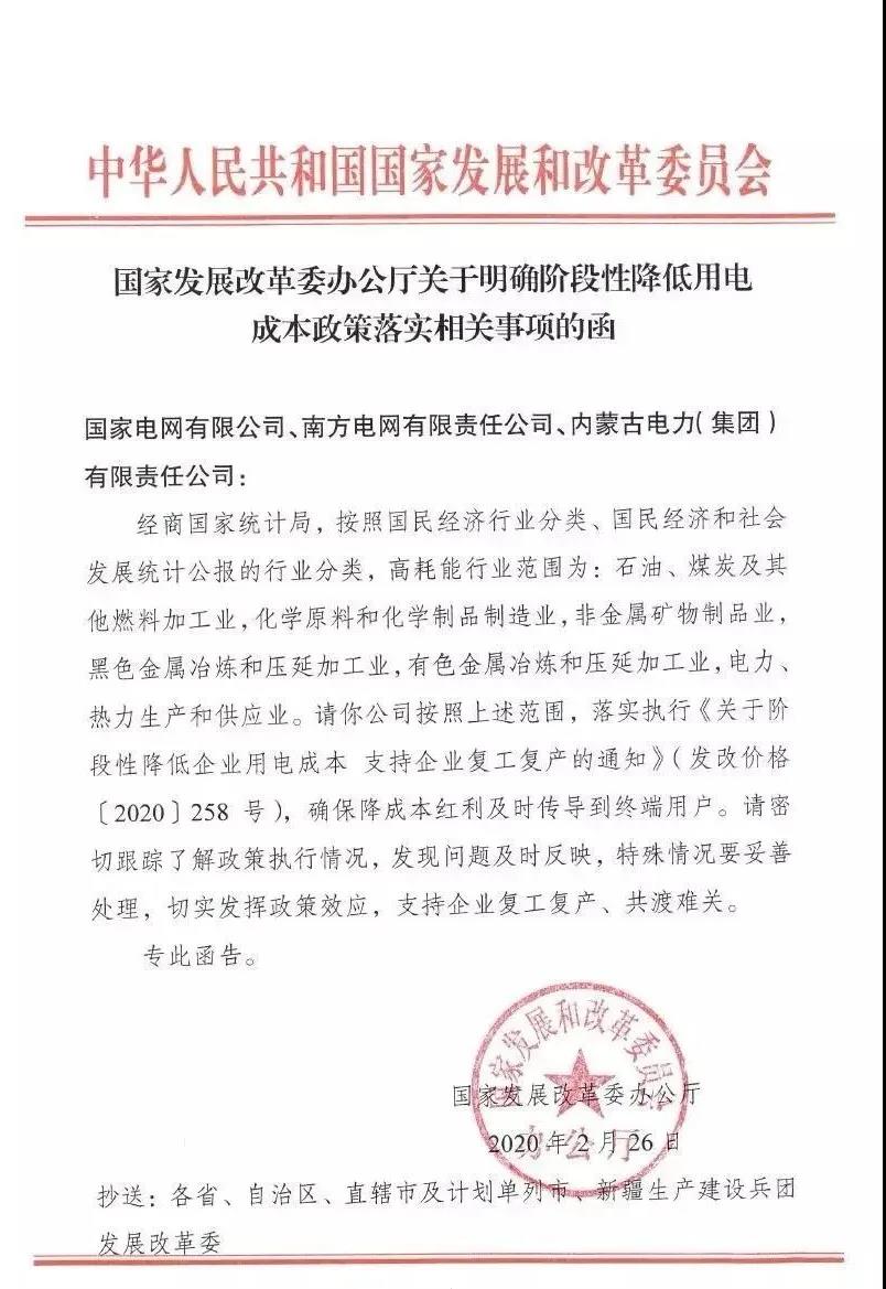 中國(guó)電力網(wǎng)訊  2月22日,國(guó)家發(fā)展改革委印發(fā)《關(guān)于階段性降低企業(yè)用電成本支持企業(yè)復(fù)工復(fù)產(chǎn)的通知》,明確自2020年2月1日起至6月30日止,對(duì)除高耗能行業(yè)用戶外的一般工商業(yè)電力用戶實(shí)行優(yōu)惠電價(jià)政策,統(tǒng)一按原到戶電價(jià)水平的95%結(jié)算。