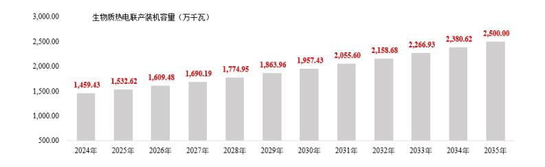 根據(jù)國家發(fā)展改革委、國家能源局發(fā)布的《關于促進生物質能供熱發(fā)展的指導意見》(發(fā)改能源[2017]2123號),到2035年,生物質熱電聯(lián)產裝機容量超過2500萬千瓦,生物質能供熱在具備資源條件的地區(qū)實現(xiàn)普及應用。根據(jù)該指導意見確定的目標,未來生物質熱電聯(lián)產裝機容量預計發(fā)展情況如下:
