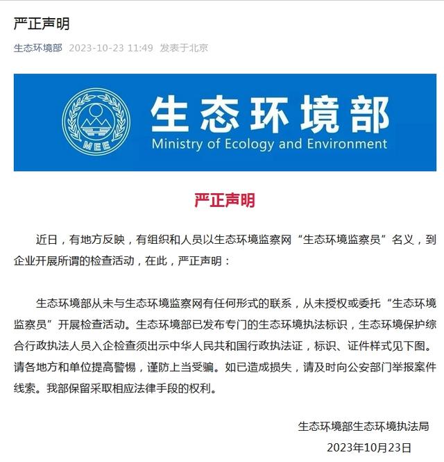 據(jù)生態(tài)環(huán)境部公眾號10月23日消息,近日,有地方反映,有組織和人員以生態(tài)環(huán)境監(jiān)察網(wǎng)“生態(tài)環(huán)境監(jiān)察員”名義,到企業(yè)開展所謂的檢查活動,在此,生態(tài)環(huán)境部嚴正聲明: