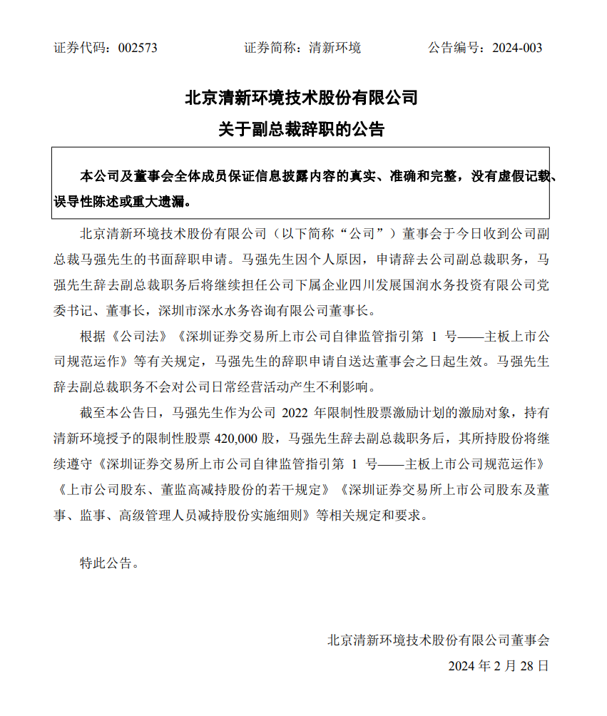 2月28日,清新環(huán)境發(fā)布公告稱,公司董事會(huì)于當(dāng)日收到公司副總裁馬強(qiáng)先生的書面辭職申請(qǐng)。馬強(qiáng)先生因個(gè)人原因,申請(qǐng)辭去公司副總裁職務(wù),馬強(qiáng)先生辭去副總裁職務(wù)后將繼續(xù)擔(dān)任公司下屬企業(yè)四川發(fā)展國潤水務(wù)投資有限公司黨委書記、董事長,深圳市深水水務(wù)咨詢有限公司董事長。