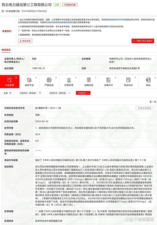 4月27日,本報(bào)從信用中國(guó)獲悉,由于違反水污染防治法,近日,西北電力建設(shè)第三工程有限公司被罰款66萬(wàn)元。