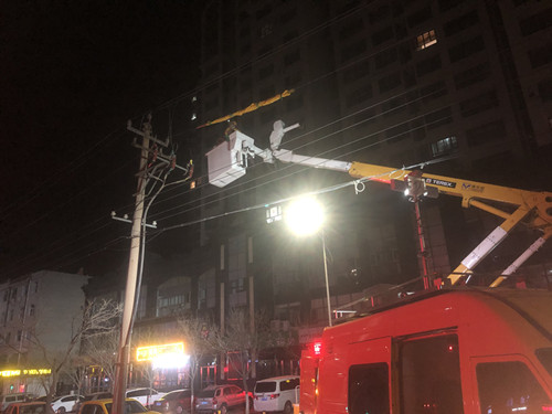 在應(yīng)急搶修燈的照明下,絕緣斗臂車絕緣臂緩緩升起,作業(yè)人員緩緩向作業(yè)點靠近,由于是夜間帶電搶修,作業(yè)能見度等條件較為不足,工作負責人不敢有一絲大意,嚴密監(jiān)護作業(yè)人員的行為。兩名帶電作業(yè)操作人員站在10多米高空的作業(yè)斗內(nèi),小心翼翼的包絕緣毯,套絕緣管,更換燒壞的熔斷器……一道道作業(yè)流程嚴謹有序,經(jīng)過3個半小時的連續(xù)搶修,故障搶修順利結(jié)束,受損線路恢復(fù)供電。