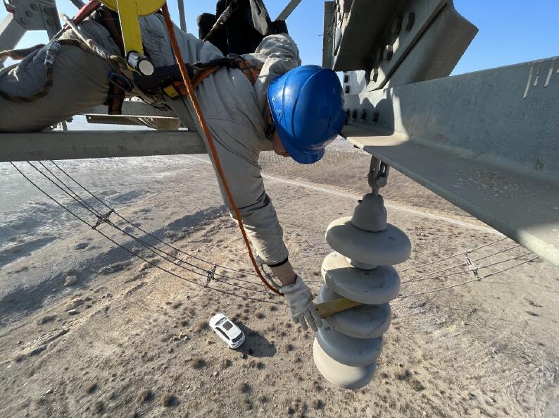 該處精心組織,提前對污染物較多的工業(yè)園區(qū)、礦場、發(fā)電廠等地進行實地勘察,結(jié)合污區(qū)分布圖選定取樣點位置,制定2022年鹽密測試計劃。鹽密取樣工作對作業(yè)人員的技術以及作業(yè)環(huán)境要求極為嚴格,此次取樣工作采取地電位作業(yè)方式,作業(yè)人員在鐵塔上既要與周圍帶電體保持足夠的安全距離,還要對取樣絕緣子進行精細操作,作業(yè)人員具備出色的身體素質(zhì)和心理素質(zhì),配合默契,圓滿完成工作。