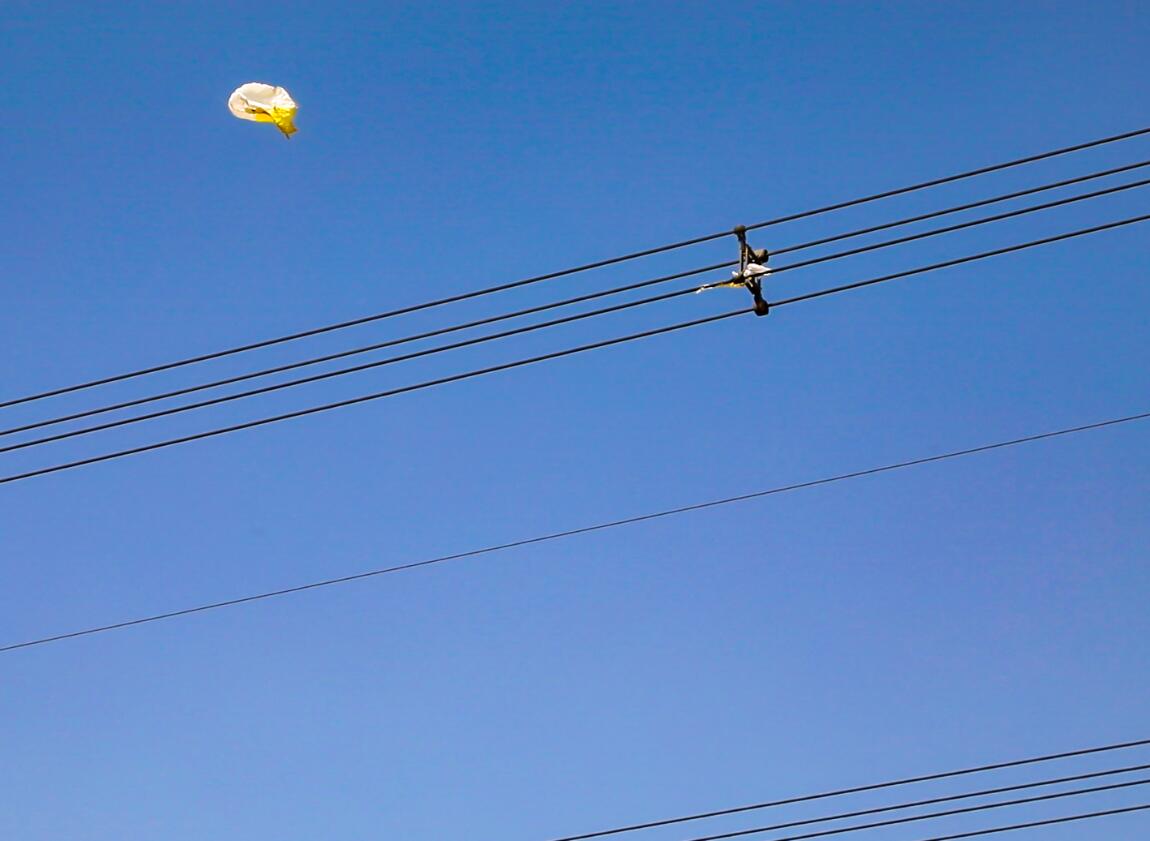 中國(guó)電力網(wǎng)  2022年10月18日,在河南滑縣上官鎮(zhèn),國(guó)網(wǎng)滑縣供電公司工作人員王科炎、張彥強(qiáng)利用電網(wǎng)異物激光清除儀將兜掛在500千伏導(dǎo)線上的氫氣球成功擊落,消除了線路安全隱患。