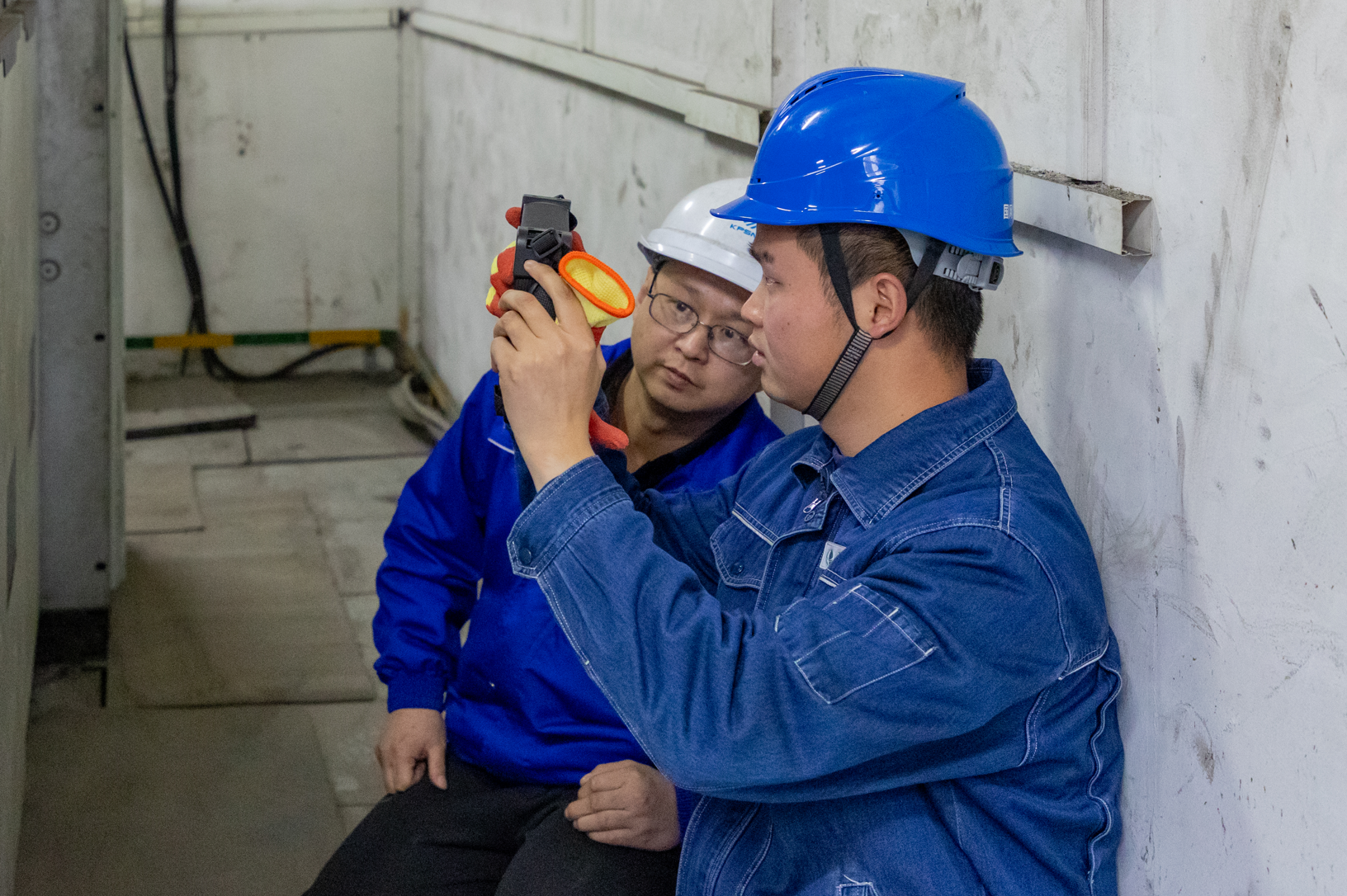“變壓器高壓側(cè)A相樁頭19攝氏度……溫度正常,運(yùn)行狀態(tài)無(wú)異常。”程韋手持測(cè)溫儀檢測(cè)用戶10千伏變壓器樁頭溫度,查看變壓器油位、油溫,確定檢測(cè)值均在設(shè)備運(yùn)行的正常范圍內(nèi)。隨后,利用聲紋相機(jī)逐一檢查每臺(tái)高壓柜的局放值,并透過(guò)觀察窗檢查進(jìn)出線電纜情況,確保每相電纜都運(yùn)行正常。