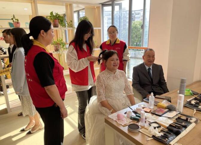 當(dāng)天,該分局青年志愿者早早來到拍攝場地布置背景墻。不一會兒,拍攝現(xiàn)場擠滿了前來照相的老人?;顒又校慌缘闹驹刚哌€會主動上前為老人打理發(fā)型、幫忙整理服飾。“我們結(jié)婚五十多年了,從沒拍過婚紗照,今天在家門口實現(xiàn)了婚紗夢,彌補了我們的遺憾,真是太感謝你們了。”年邁的劉奶奶開心地對志愿者們說道。