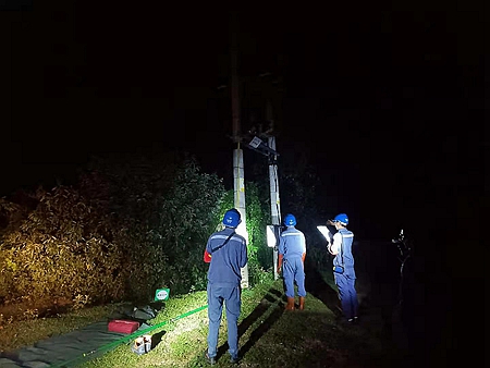 中國電力網(wǎng)訊 近日連續(xù)10多天暴雨天氣,氣溫下降到17度,穿兩件衣服都冷,8月18日16時40分35千伏勐佑變10千伏魚塘線49號桿G01斷路器跳閘,10千伏魚塘線49號桿G01斷路器后段線路故障停電,故障停電涉及魚塘村20個臺變,及時做好涉及停電片區(qū)群眾工作。