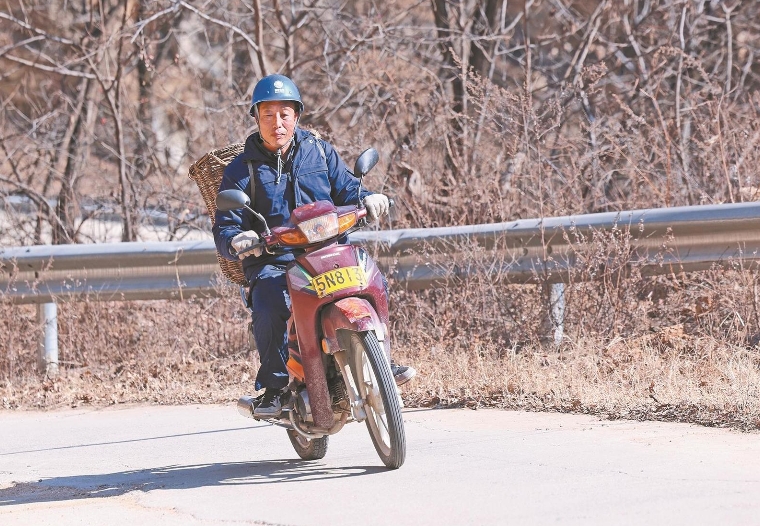 邢海明騎著摩托車、背著背簍去山里給老人送生活用品。