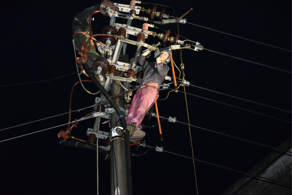 該線路斷線區(qū)域處于陡坡地勢復雜,且雨天較滑,搶修放線工作難度較大。在各部門的討論部署下,23名搶修人員做好搶修準備工作趕往現(xiàn)場。盡管多方面原因導致?lián)屝揠y度大、任務重,但搶修人員毫無怨言,大家只想讓停電用戶能夠盡早用上電。雨勢稍有減停,晚上8時在調度部門的許可下斷開10千伏亨泰線開關,搶修人員做好相關安全防護措施,搶修工作有序進行......