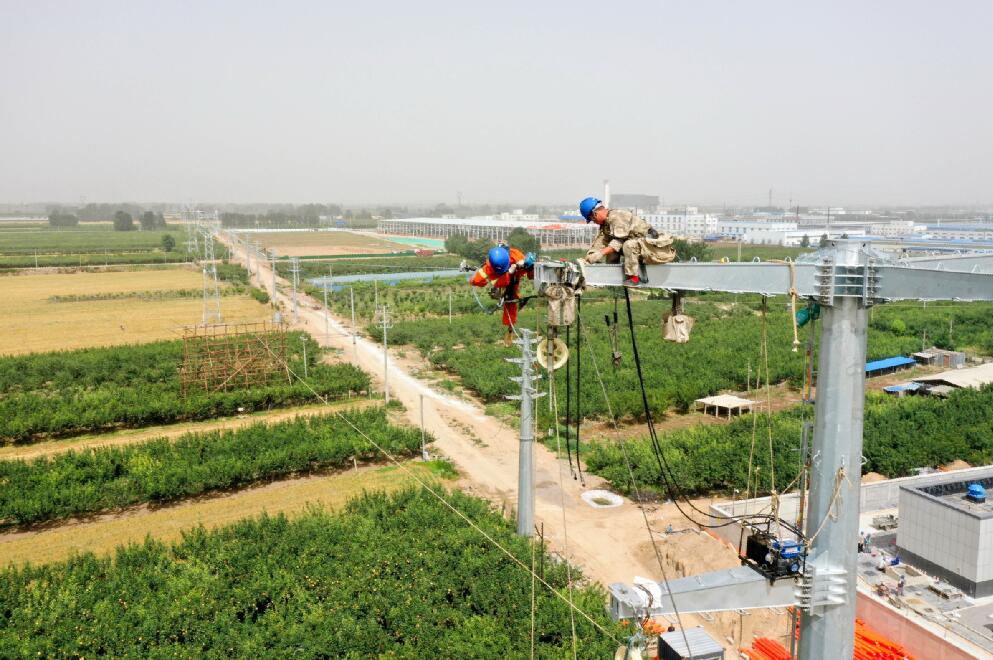 近日,河北省石家莊晉州市氣溫持續(xù)攀升,在河北石家莊晉州園區(qū)110千伏輸變電線路工程施工現(xiàn)場,國網(wǎng)石家莊供電公司的50多名施工人員正在有條不紊地開展張力放線施工作業(yè)。