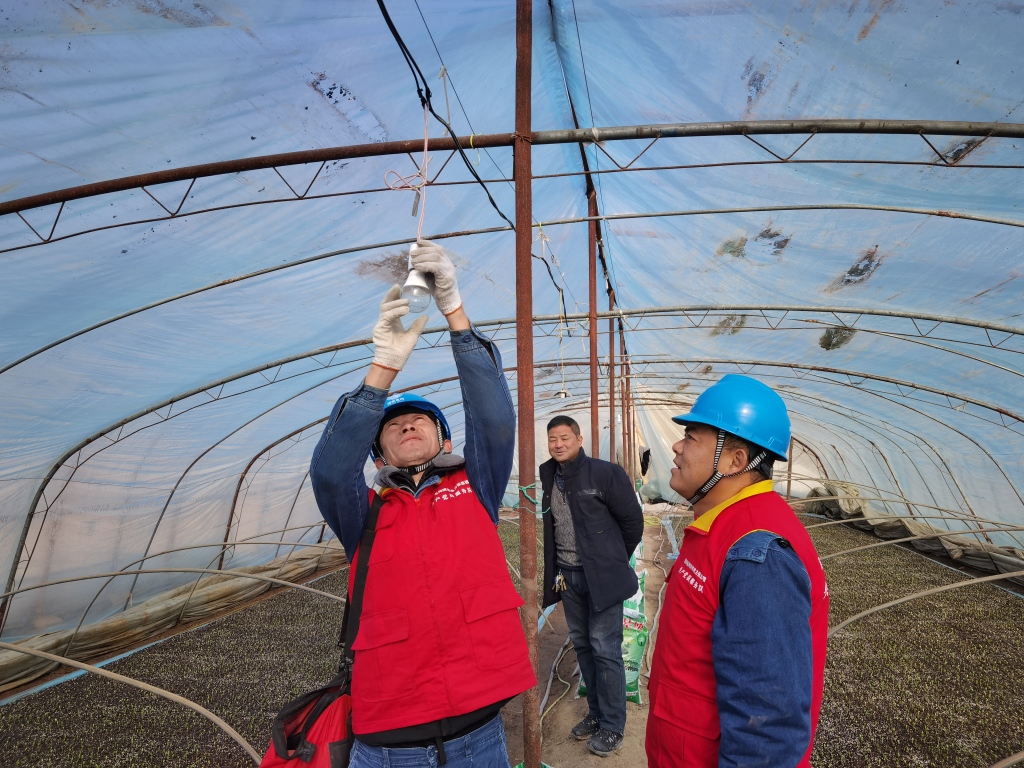 國(guó)家電網(wǎng)陜西電力張思德(頻陽(yáng)之光)黨員服務(wù)隊(duì)在念田村甜瓜大棚更換補(bǔ)光燈。