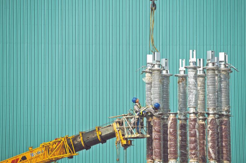2019年,在張北柔直工程±500千伏康保換流站工程施工現(xiàn)場,施工人員吊裝橋臂電抗器。 鄒明 攝